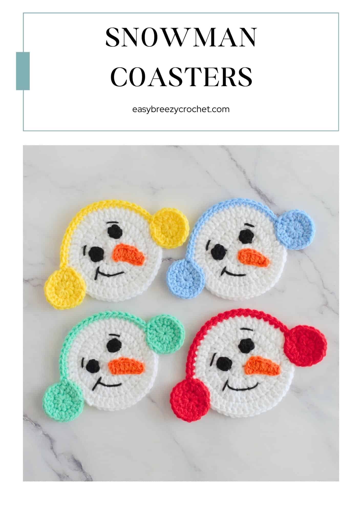 The finished size of this crochet snowman coaster is about 4.5 inches (11.4 cm) in diameter not including the earmuffs.