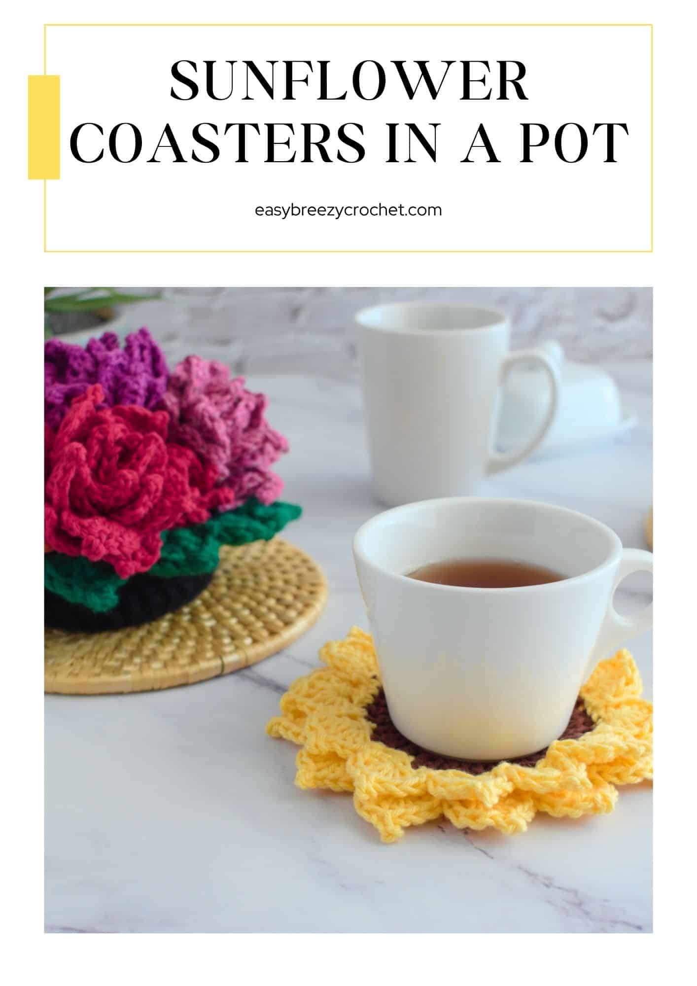 These crochet sunflower coasters in a flower pot make lovely gifts for any occasion. Whether it is Christmas, Mother's Day, a housewarming, or just to say thank you, these charming and practical coasters are sure to bring a smile.